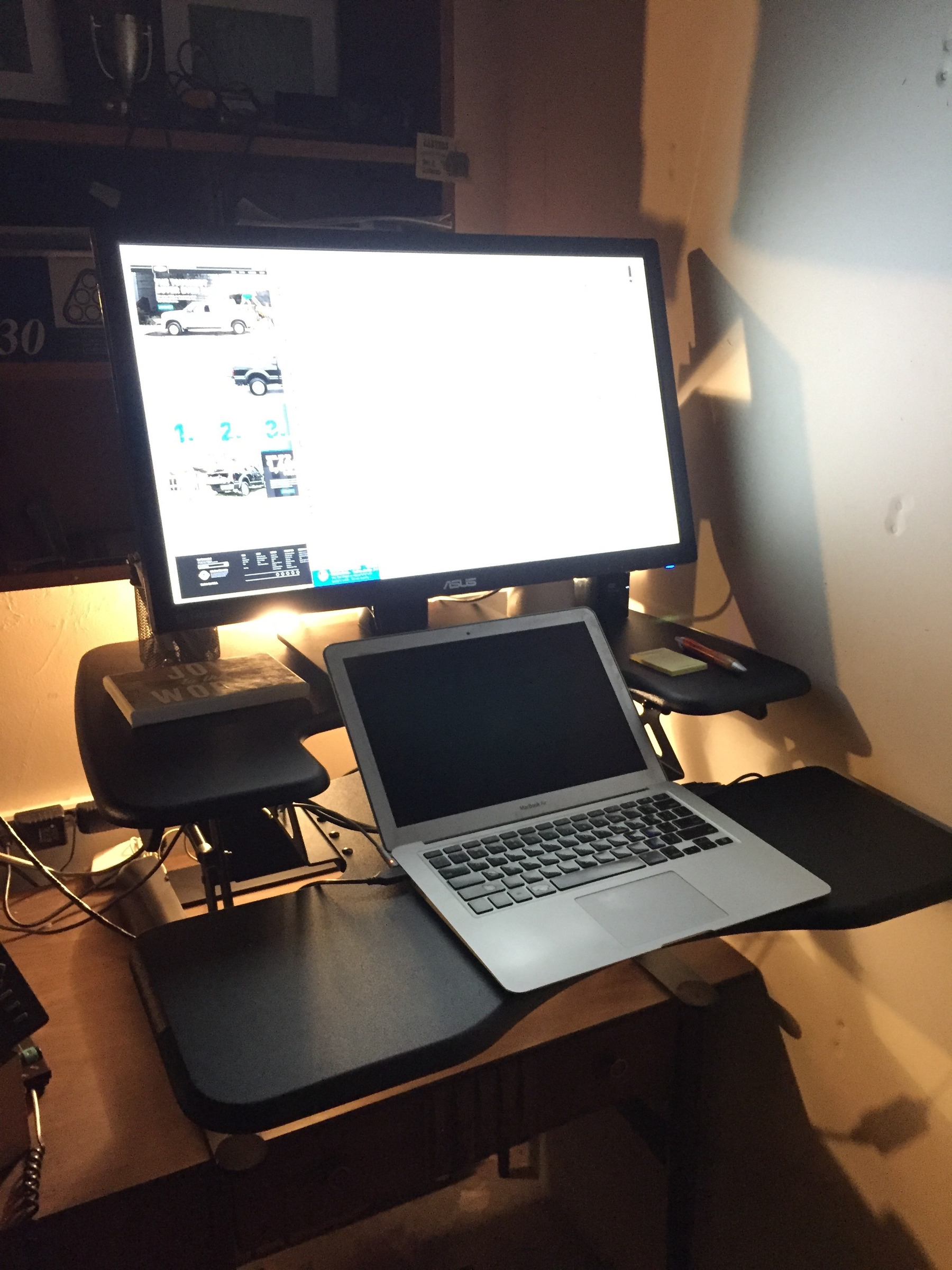 I set up my sit-stand desk this afternoon, courtesy of DiamondBack Truck Covers and Varidesk. Here’s to my long-term physical health. Now to get a standing mat.